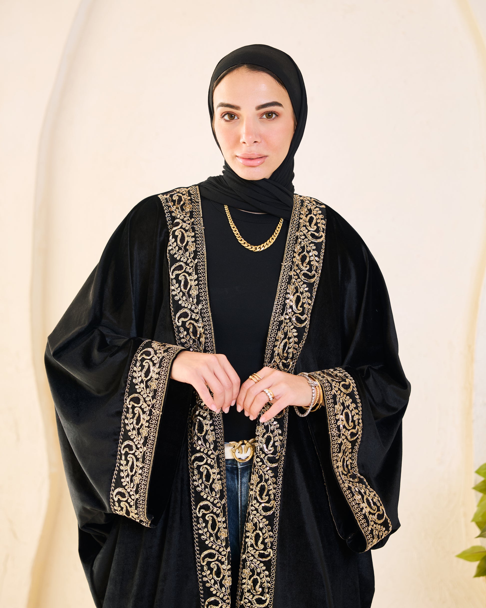 Immerse yourself in understated luxury with our Black Heritage Kaftan. This piece moves away from traditional muted tones, offering a sophisticated contrast of deep black velvet with intricate gold embroidery that feels both grounded and ethereal.